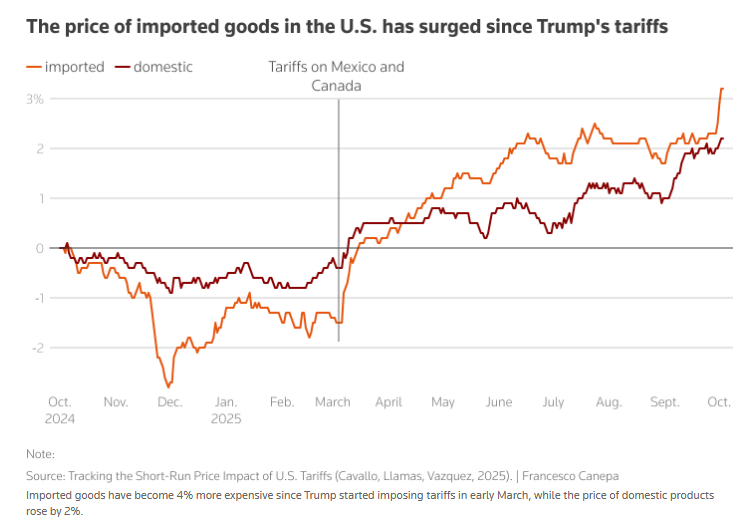 路透社网站报道截图。哈佛大学教授阿尔贝托·卡瓦洛和研究人员的追踪发现,自美国政府3月初开始征收关税以来,进口商品价格上涨了4%,而其国内产品的价格上涨了2%。