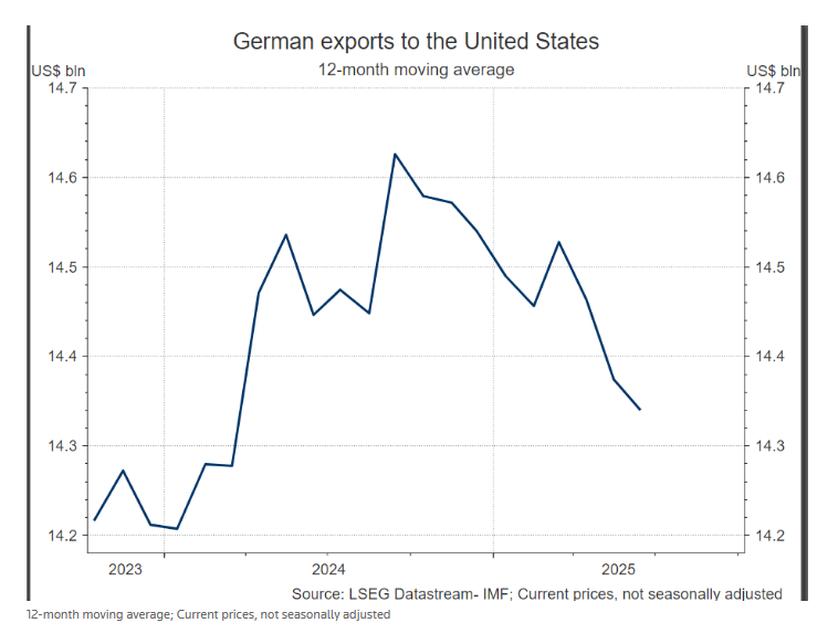 路透社网站报道截图。图表显示出近期德国对美国出口的变化。